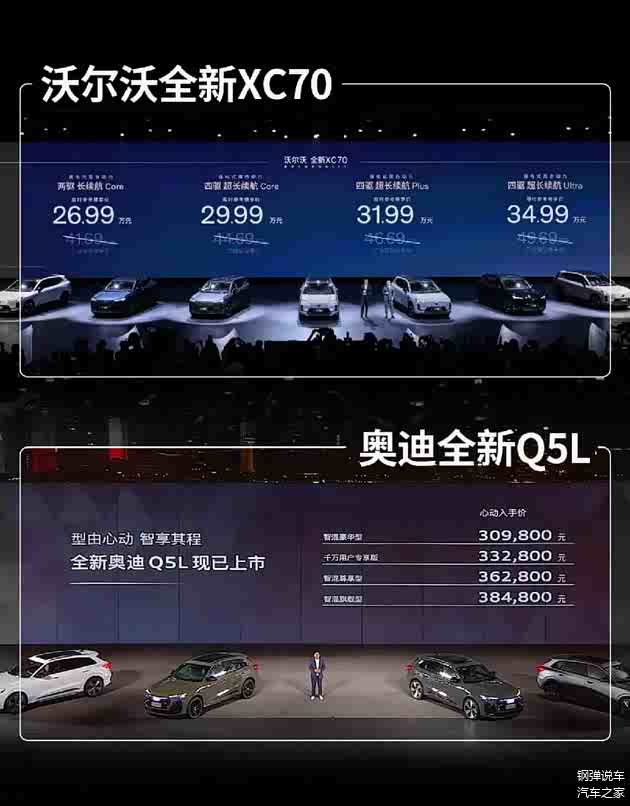 全新Q5L在上市后,也给到了30.98万-38.48万的价格区间。两款车价格有所重叠,全新XC70更占优势。