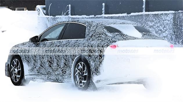 视线转到侧面,它没有盲目追求极致风阻而把自己变成“邪恶大鼠标”,而是保留了传统三厢轿车那份圆润、优雅的线条。腰线采用了分段式设计,光影流转间层次感分明。谍照中那套五辐式轮毂造型相当夸张,甚至带着一丝改装车的野性,如果不只是测试件而是量产标配,那这台车的运动属性绝对值得期待。