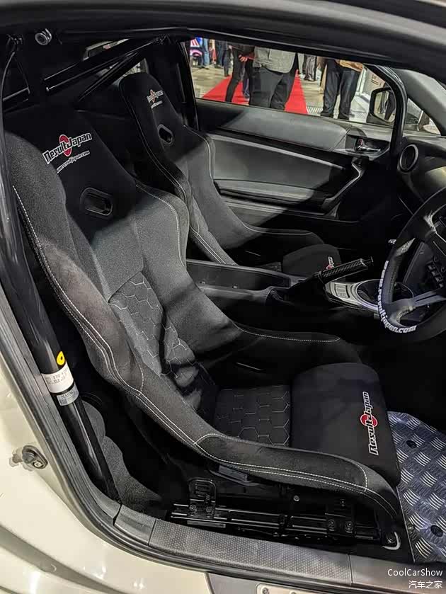 这辆NEO86的内饰正如它的外观一样充满竞技气息,跨过撑满驾驶舱的防滚架之后,所见之处换上了Result的竞技方向盘、加长挡把,还有质感很好的翻皮赛车座椅,另外地毯也换成了防滑的铝合金板。