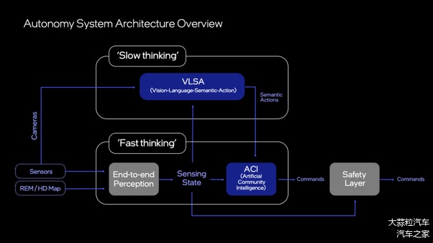 针对此,Mobileye提出的技术路径是:VLSA(Vision-Language-Semantic-Action,视觉-语言-语义-动作),本质上它是一种VLM系统,能够输出语义信息。