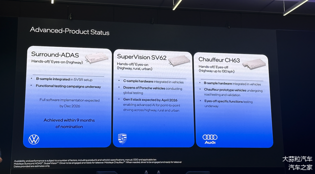 保时捷新一代SuperVision项目,目前在进行软件栈的开发完善,功能将包含基于AI、覆盖高速和城区的点到点辅助驾驶;而奥迪的Chauffeur项目,样车已经开始道路测试验证,而针对Eyes-off(驾驶员视觉脱离)的功能也即将开始测试。