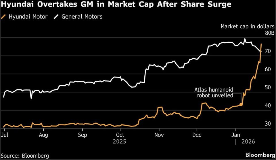 现代汽车股价大涨15%,市值首次超过100万亿韩元,一举超过通用汽车,成为全球市值第四的汽车制造商。而助推现代股价大涨的主要因素,是人工智能业务。 CES期间现代大秀人工智能硬件,特别是以Atlas人形机器人开发商Boston Dynamics为中心的机器人业务。现代计划从2028年开始在制造工厂部署人形机器人,并计划在全球每年生产30,000台Atlas,为其创造约40亿美元的额外收入。 这也解释了为何包括特斯拉、小鹏等在内的汽车制造商都在积极布局人形机器人业务。