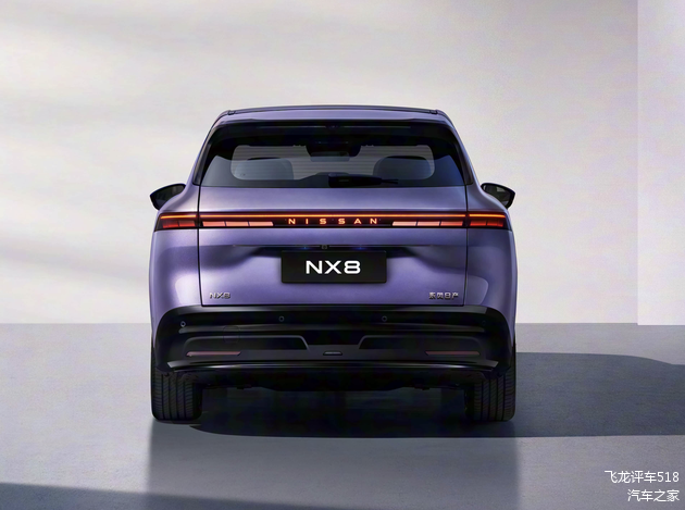 颜值方面,日产NX8沿袭日产家族最新的V-Motion设计理念,更加符合新能源汽车时代的特征。前脸采用了封闭式的格栅,并配备了可发光的NISSAN车标,2.4米贯穿式星环灯和下方矩阵式大灯都加入了黑色装饰边框,不仅带来了十足的科技感,也带来性能车的神秘气息。前包围采用了一体化设计,黑色的横幅式中网搭配着黑色的前唇,两侧对称设计的黑色导流槽也融入其中,整体感更强。车尾采用了上窄下宽的轮廓,车顶向后延伸出了黑色后扰流板(内置横向高位刹车灯),贯穿式的尾灯加入了黑色的灯罩,内部由2064颗OLED组成的量子光幕也更加科幻,支持自定义灯语,有着不错的可玩性。