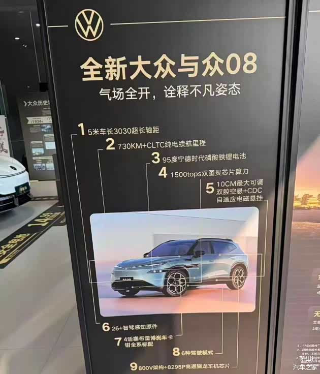此前安徽大众正式发布全新中大型 SUV—— 与众 08 官图。据了解,新车将于 2026 年在大众汽车(安徽)正式投产,并搭载 L2++ 级辅助驾驶,并有 800V 超快充,CLTC 续航超 700 公里。