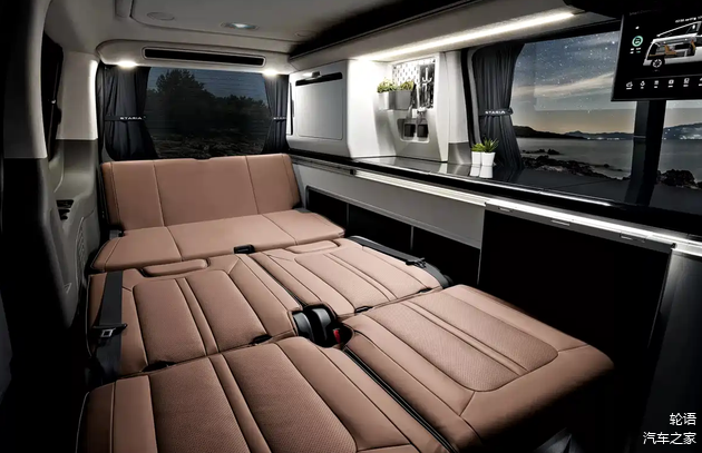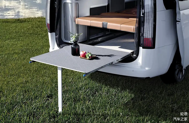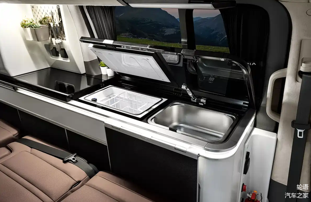 内饰方面,第二排座椅可完全放平,扩展为更大的双人床区域。车内集成洗手盆、冰箱、可移动小桌板、厨房台面、控制屏幕及各类挂件,营造出温馨的居家氛围。车尾设计支持向外拓展移动桌板,并提供室外淋浴功能。
