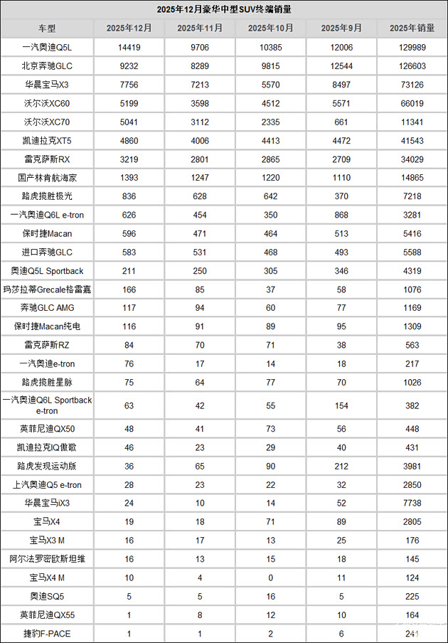 在2025年12月,一汽奥迪Q5L依靠经销商的大幅降价促销获得了销量环比大幅提升,售出14419辆,在极具竞争力的市场售价面前,不少消费者可以接受老款车型。在2025年,Q5L的年销量达到129989辆,也是一个非常不错的成绩。此外,Q5L Sportback在2025年也售出4319辆。对于一款临近换代的老车,Q5L在2025年的销量表现可以让人满意。