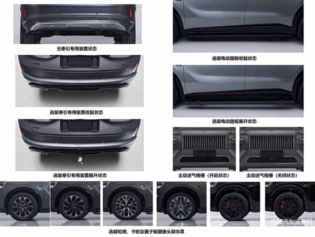 从此前申报信息来看,极氪8X不仅有20/21/22寸在内的多种轮毂选择,还提供了格栅/后视镜/车窗边沿饰条在内的黑化版本,进一步强化其年轻气质。动力方面也是2.0T+电机组成的插混系统,发动机最大功率205kW,其三电机版本综合功率高达1030kW,数据上和极氪9X三电机版本一致,当然,未来它也会有 入门的双电机版本。