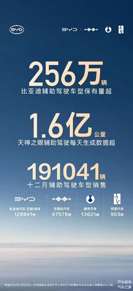 当辅助驾驶从汽车行业的 “加分项” 变成用户购车的 “必选项”,比亚迪用实力给出了最优解。截至 2025 年 12 月,比亚迪辅助驾驶车型累计保有量超 256 万辆,稳居中国车企第一,让 “全民智驾” 的承诺照进现实,让技术普惠走入千家万户。