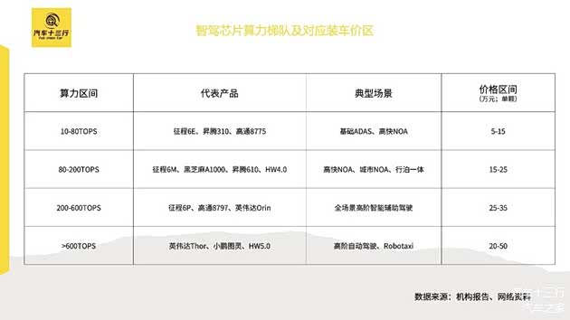 在2022~2024年之间,行业内普遍认为实现高速NOA需要30-50TOPS算力,而实现城市NOA因为需要识别信号灯、无保护左转、绕行障碍等功能,因此门槛极高,起步至少要200-500TOPS,甚至为留足算力冗余需要1000TOPS的芯片。