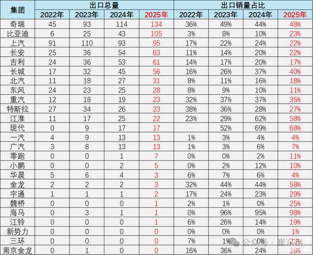 从出口的汽车集团来看,已经呈现出了“三巨头”的格局,奇瑞、比亚迪、上汽集团的出口量分别达到134万、105万、95万辆。