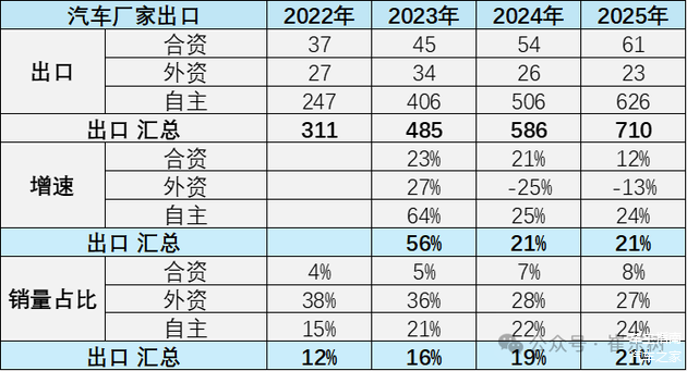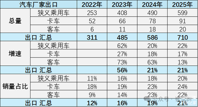 2025年我国汽车厂家国产车出口总量达710万辆,同比增长21%,维持了上一年的增速,继续稳坐全球汽车出口第一大国的宝座。出口市场呈现“量价齐升、结构优化”的特征。