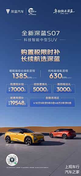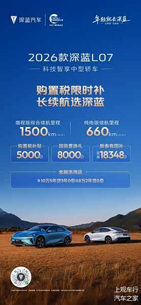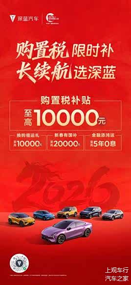 马年行好运,新春购新车。春节前夕正值购车政策红利期,选择深蓝汽车,也就意味着将同时获得 “央企品质保障、长续航核心优势、全系限时补贴” 三重利好。2026,和深蓝一起,即刻焕新座驾,解锁新春出行新体验!