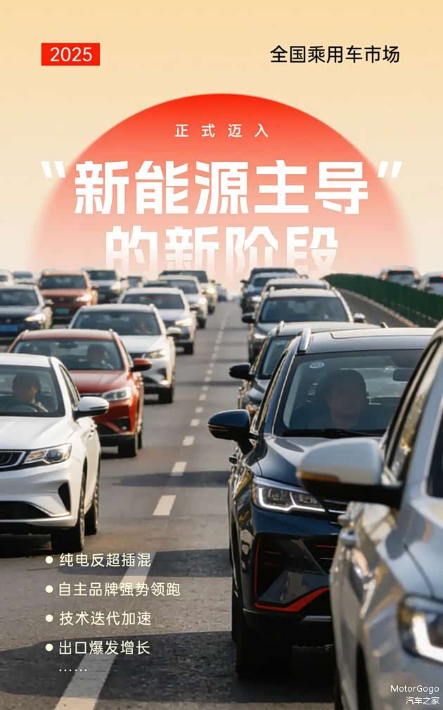 在政策切换、成本波动与技术革新交织等多方面因素的影响下,2025 年全国乘用车市场正式迈入“新能源主导”的新阶段,纯电反超插混与自主强势领跑成为全年最亮眼的标签。