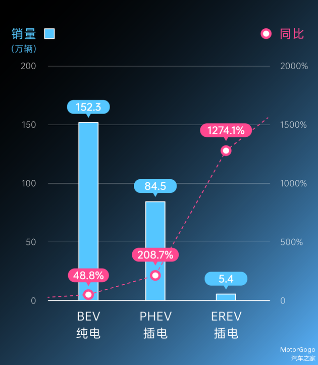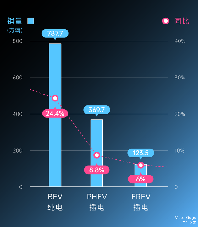 若以批发量计算,纯电车型全年批发 946.2 万辆,远超插混车型的 452.4 万辆与增程车型的 133.3 万辆。