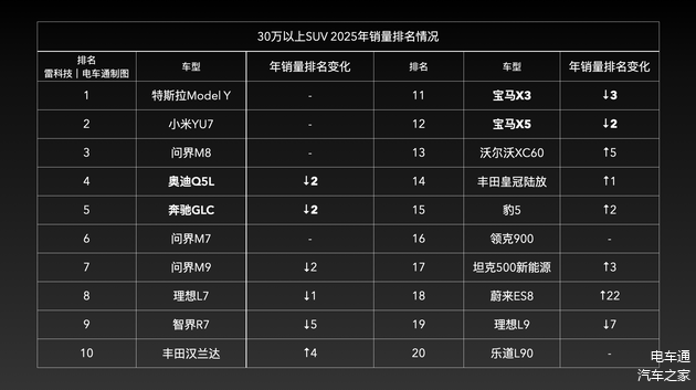 回看去年30万以上SUV战场:奥迪Q5L、奔驰GLC、宝马X3/X5这些老牌贵族节节败退;而对面,小米YU7、问界M8、 蔚来ES8等新贵正集体冲高。