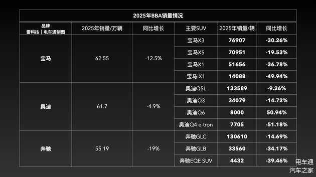 为什么BBA突然失速了?电车通经过分析后发现,导致它们整体失速的核心,恰恰出在SUV细分市场,旗下卖得最好的SUV几乎都「扑街」了。
