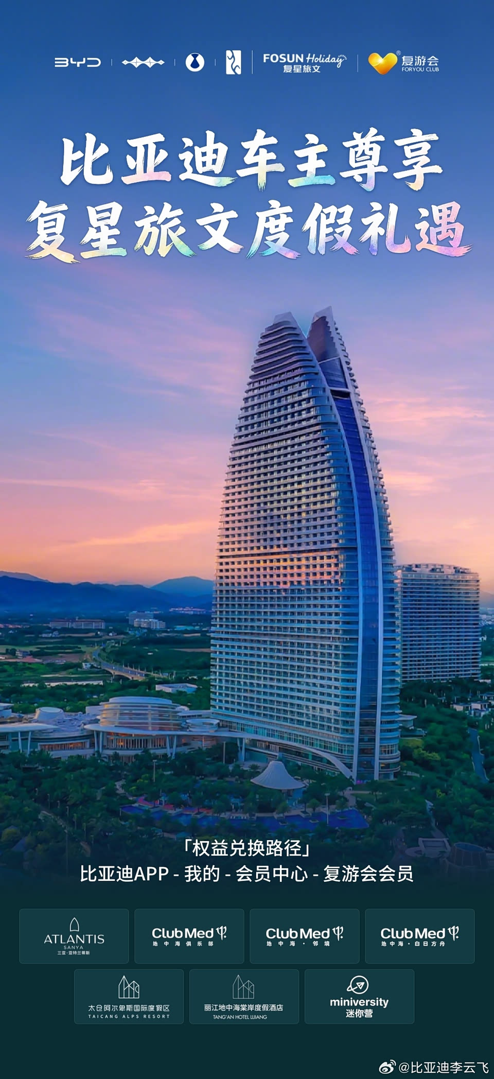 比亚迪与复星会员互通:首个项目落地车主权益!以生态协同拓展生活维度。作为参考:复星旅文各业务板块在全球拥有超2000万会员。目前,复游会会员权益已在比亚迪 App 正式上线。比亚迪全品牌(比亚迪、方程豹、腾势、仰望)车主,均可通过比亚迪 App 一键兑换复游会高等级会员会籍,解锁三亚·亚特兰蒂斯、地中海·邻境、地中海·白日方舟、Club Med地中海俱乐部等全国多个高端度假目的地的专属礼遇