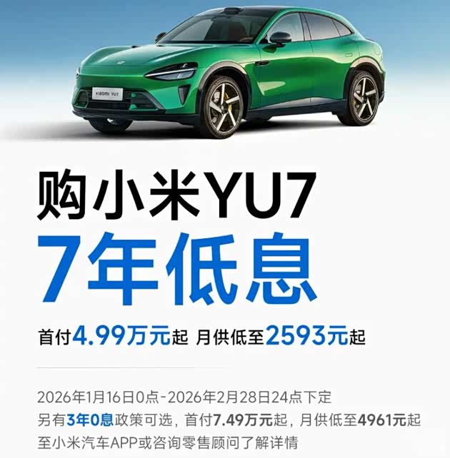 回顾小米YU7相关的7年低息金融购车方案,自1月16日起,截至到2月28日24点下定小米YU7,可享受7年低息政策,首付低至4.99万元起,月供低至2593元起,用户可以灵活选择首付比例和还款周期,如果选择3年0息政策,那么首付是7.49万元起,月供低至4961元起,这套方案对于月收入稳定且手上预算充足的朋友来说更为划算,节省下来的钱还可以用来理财增收,不至于一次性投入在车上面,形成大额理财收益的损失。而对于有能力承担长期还款压力的朋友来说,小米这次推出的7年低息方案是“电动车平权”概念的开始,它的出现拉低了小米用户群体的门槛。