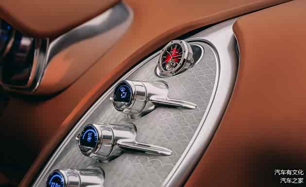 最骚的操作来了:在中控台上,布加迪居然镶嵌了一块爱彼定制的皇家橡树陀飞轮腕表。这块表不仅能看时间,它还能随着车辆的运动自主上链。这可能是世界上最贵的原厂车载时钟了,毫无疑问比很多人的房子都贵。建议车主下车时锁好门,毕竟这表可能比车更招贼。