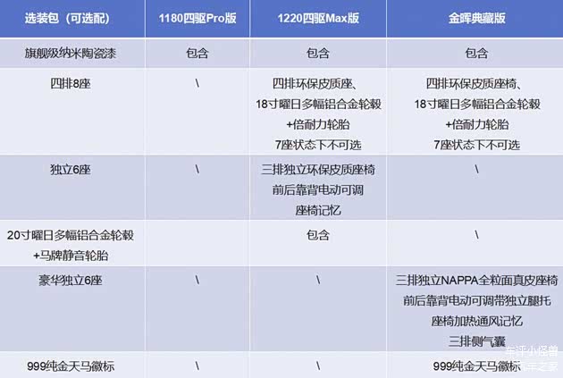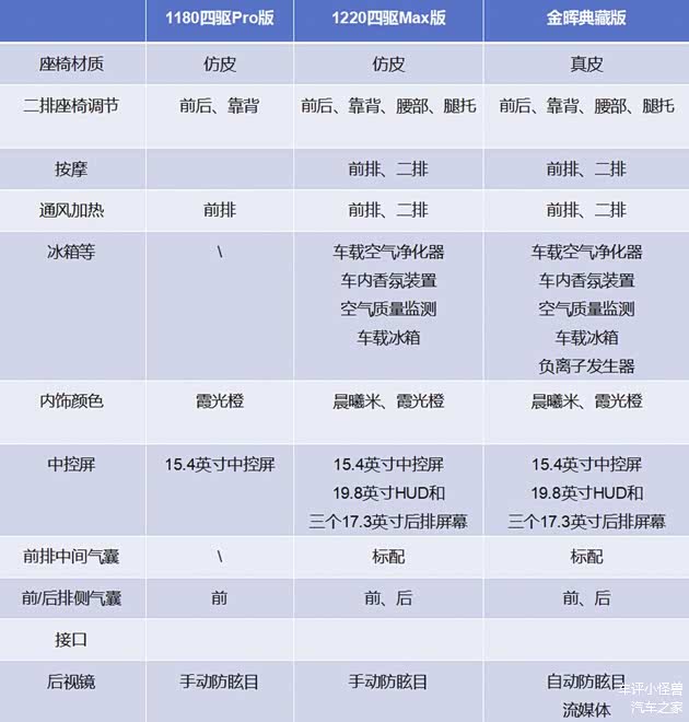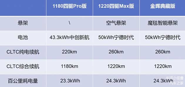 这三款车分别是1180四驱Pro版、1220四驱Max版和金晖典藏版,厂商指导价分别是