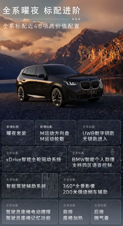 新款宝马X3提供3款车型,售价区间为31.8-39.8万元。配置方面,新款X3全系标配曜夜套装、M运动方向盘、M运动轮圈、前排座椅加热、驾驶员座椅电动腰撑+记忆、5G网应用、四音区智能语音、后排气囊、360°全景影像+200米循迹倒车辅助以及智能驾驶辅助系统等。中配车型增加HUD全彩平视系统,顶配车型提供免费选装磨砂灰色车漆和21英寸个性化轮圈。