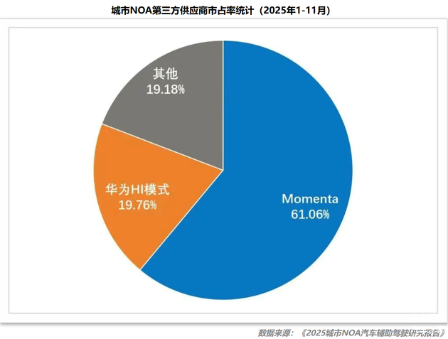 而在第三方城市NOA供应商的“排位赛”中,Momenta实现了“断层式”领跑,其搭载量达41.44万辆,市占率高达61.06%,这一数字是第二名华为HI模式(搭载量13.41万辆,市占率19.76%)的三倍之多。