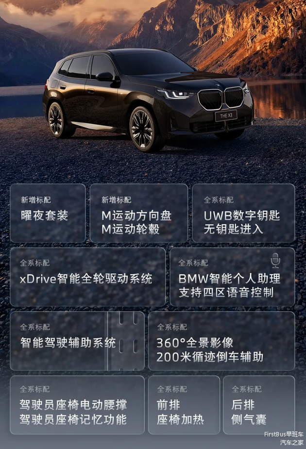 新款宝马X3全系标配曜夜套装、M运动方向盘、M运动轮圈、前排座椅加热、驾驶员座椅电动腰撑+记忆、5G网络能力、四音区智能语音、后排气囊、360°全景影像+200米循迹倒车辅助及智能驾驶辅助系统。中配车型增加HUD全彩平视系统,顶配车型可免费选装磨砂灰色车漆和21英寸个性化轮圈。