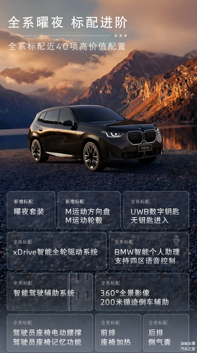 新款X3则在全系车型中标配了曜夜外观套装、M运动方向盘、M风格轮圈、前排座椅加热、驾驶座电动腰撑及位置记忆、5G网络、四音区语音交互、后排气囊、360度全景影像与200米循迹倒车辅助,以及智能驾驶辅助系统。中配车型增加了HUD全彩平视系统,顶配版本可以免费选装磨砂灰色车漆和21英寸个性化轮圈。