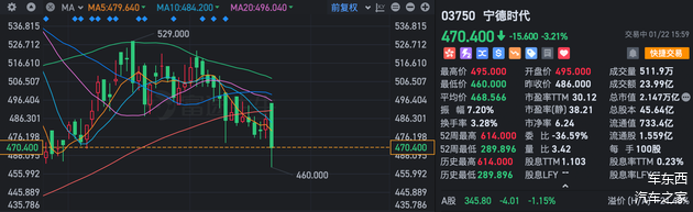 截止发稿时,宁德时代港股下跌3.21%,股价报470.4港元/股(约合人民币404.5元/股),股价处于近一个月来的最低位。