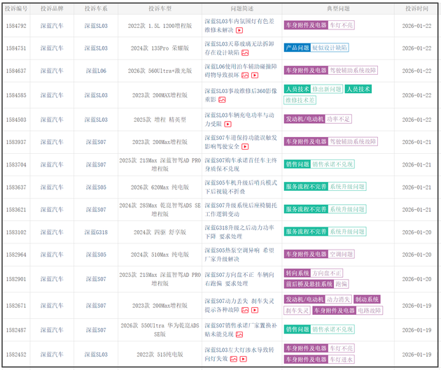 一位深蓝S07车主投诉称,1、电池故障:2026年1月21日,车辆充电时4分钟内从20%飙升至100%,明显违背正常充电逻辑;1月25日该问题再次发生,已无法正常充电使用。2、行驶中动力消失故障:故障期间,车辆在道路正常行驶时突发加速踏板无动力响应,踩下踏板后无任何动力输出,当时车流密集,险些引发追尾交通事故,属于危及人身安全的重大故障。