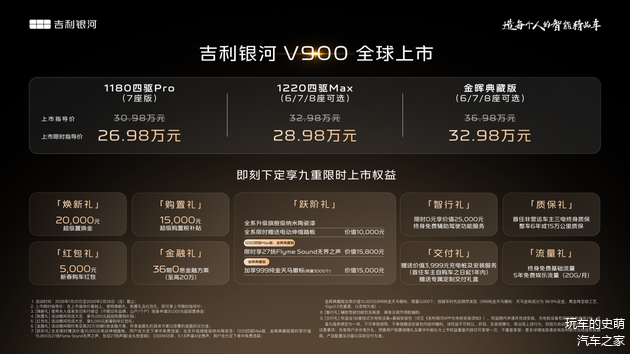 这次银河 V900 共推出 3 个车型,限时指导价诚意十足:1180 四驱 Pro(7 座版)26.98 万、1220 四驱 Max(6/7/8 座可选)28.98 万、金晖典藏版(6/7/8 座可选)32.98 万(原指导价 36.98 万)。