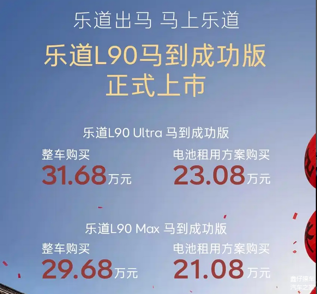 日前,我们从乐道汽车官方获悉, 乐道L90马到成功版正式上市,新车提供整车购买和电池租用两种方案,整车售价在29.68-31.68万元区间,而电池租用方案起步价为21.08-23.08万元。此次车型更新在保持基础配置的前提下,针对外观和内饰进行了专属升级,并引入定制套装和购车优惠政策,旨在丰富消费者的选择,同时优化购车体验。