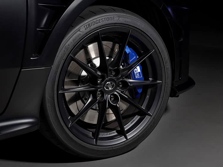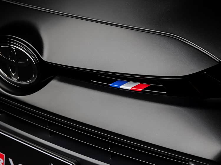 新车配备Aero性能套件,包括前唇、侧裙和后扩散器的空气动力优化设计。车身涂装采用Black Gravite专属颜色,视觉延展性强,同时在后翼子板增加GR拉花标识,提供身份识别。轮毂使用哑光黑色设计,搭配蓝色制动卡钳,兼顾视觉冲击和热管理性能。前进气格栅装饰法国国旗元素,呼应车手Sébastien Ogier的国家背景,同时强调细节辨识度。