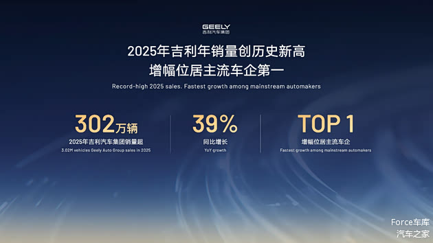 2025年,吉利汽车集团累计销量302万辆,创下历史新高,同比增长39%,增幅位居主流车企第一位。2026年,吉利汽车集团将全年销量目标定为345万辆,其中出口销量目标64万辆。基于此,吉利将践行“区域深耕”+“全球协同”的全球化战略,并将在全球打造3个15万级、2个10万级区域市场,持续向全球市场输出高价值智能精品车,稳步推进高质量出海。