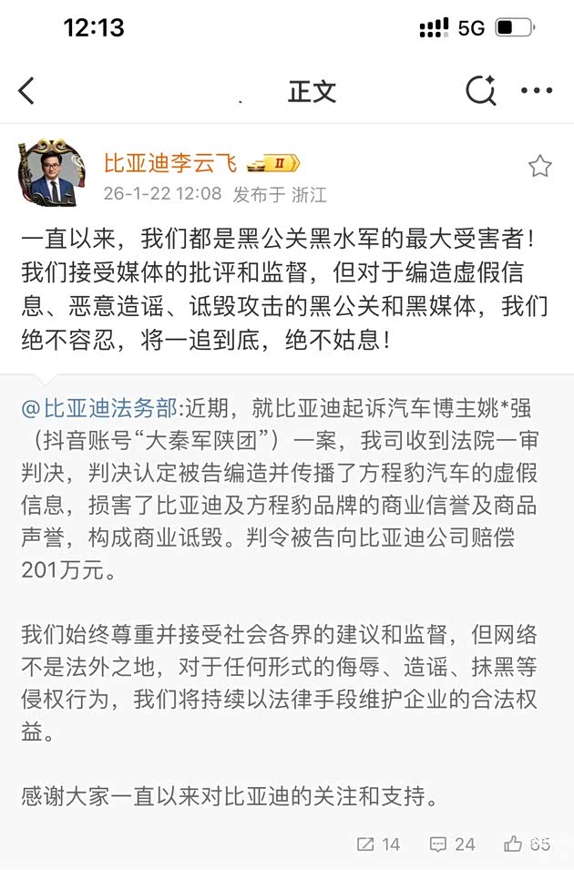 事后,比亚迪品牌及公关总经理李云飞多次表态:接受客观批评,但对恶意造谣绝不容忍。这其实也是许多踏实做产品的企业共同心声。车圈竞争日趋激烈,但竞争应当落在技术、产品与服务上。