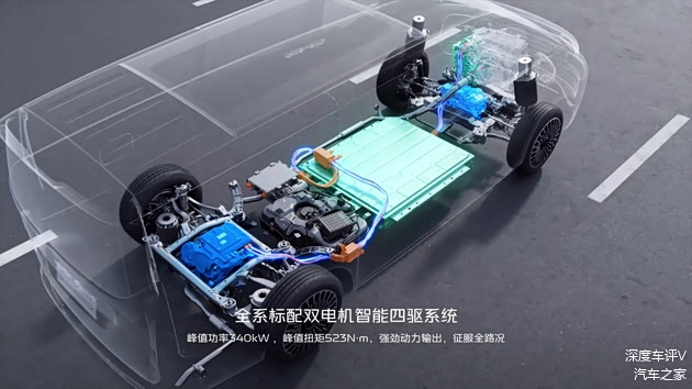 动力方面,新车标配1.5T增程器和双电机四驱系统,其中发动机最高热效率47.26%,最大功率120kW,前后电机最大功率分别为90kW和250kW,0-100km/h加速时间最快6.5s,最高车速可达190km/h。油箱容积60L,适配92号及以上汽油。Pro版配备43.3kWh中创新航三元锂电池,CLTC纯电续航里程220km,CLTC综合续航里程1180km,CLTC馈电油耗5.9L/100km;Max版和金晖典藏版则搭载50kWh宁德时代三元锂电池,CLTC纯电续航里程260km,CLTC综合续航里程1220km,30%-80%直流快充时间最快18min。三款车型均支持6.6kW对外放电功能。