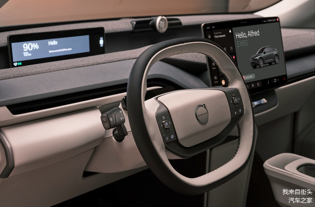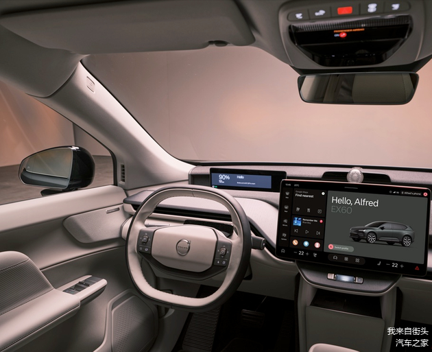 车内是沃尔沃一贯的北欧风格设计,双辐式方向盘、数位化仪表板和横向的中控屏幕,冷气出风口则隐藏在中控台上的设计线条里。仔细一看, 沃尔沃EX60取消了许多实体按键,排挡杆改为怀挡设计,而中控屏幕下方也只有两颗按键。