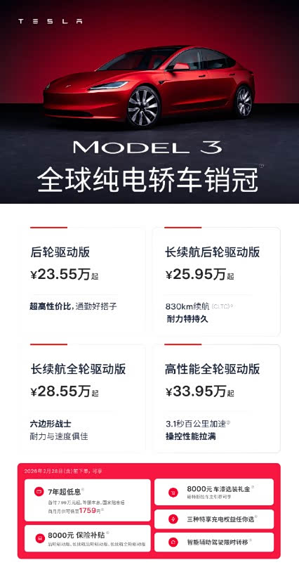 补贴适用车型:Model 3后轮驱动版、长续航后轮驱动版、长续航全轮驱动版。