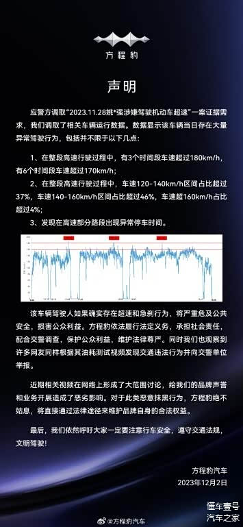 这事的起因还得说到 2023 年 12 月,方程豹豹 5 刚上市的时候,姚 * 强就用 “大秦军陕团” 这个账号发视频,说自己正常开豹 5 测试,百公里油耗居然到了 18 升,这视频当时在网上传得沸沸扬扬,好多人都被带了节奏。结果后来警方调查取证,比亚迪调出了当时的行车数据,真相直接戳穿了他的谎言:测试那天他开车全是异常操作,高速上有 3 个时段车速超 180km/h,6 个时段超 170km/h,全程高速里,120-140km/h 的车速占了 37% 还多,140-160km/h 占了超 46%,甚至超 160km/h 的都有 4% 以上。