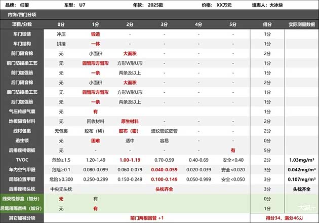 测试方法:将测试车辆在自然环境中,打开车门车窗进行完全通风;随后,将一根硅胶软管固定在司机头枕附近,模拟人呼吸位置;关闭车门车窗,将车辆停在恒温23±1℃的环境中密封静置16小时;使用采样仪从软管泵吸出10升车内空气,与酚试剂反应;将显色剂滴入酚试剂中,静置15分钟;使用醛正甲醛检测仪将显色后的样本进行检测,得出结果。