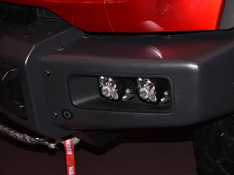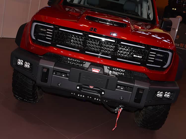 在造型层面,BJ40增程赤兔与现款车型保持一致,并未引入额外装饰性设计。整车依旧采用非承载式越野车常见的方正轮廓,车头五孔式格栅与灯组形成固定家族特征,在同级车型中具备较高识别度。这种设计并非追求视觉张力,而是为了兼顾结构强度与改装兼容性。前保险杠继续使用磨砂黑材质,并采用较为外露的结构形式,为接近角与通过性让出空间。从功能角度来看,这种处理方式有利于在复杂路况下减少覆盖件剐蹭风险,也为后期绞盘、护杠等扩展留有余量。