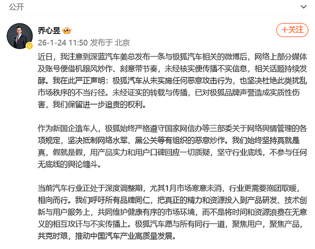 内容大意为乔心昱关注到深蓝汽车姜海荣一条与极狐汽车相关的动态,以及网络上部分媒体账号借机跟风炒作的情况。乔心昱声明极狐汽车从未实施对竞争品牌的任何恶意攻击行为,也杜绝此类扰乱市场秩序的不当行径;未经正式的转载和传播,已对极狐品牌的声誉造成实质性伤害,品牌方将保留进一步追责的权利。