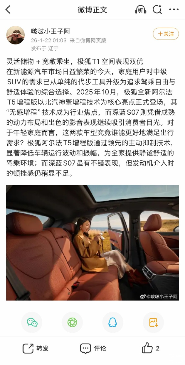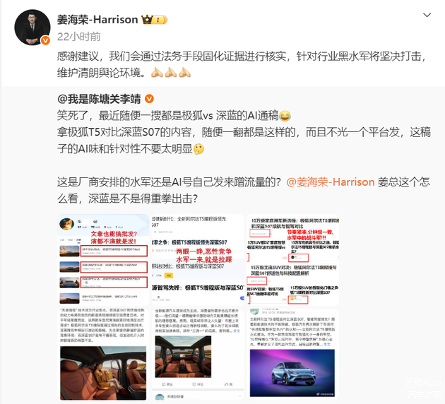 其最近发布的与极狐汽车相关的动态应当是转载评论账号名称为“我是陈塘关李靖”的动态,该账号发布内容大意为反馈“一搜索都是极狐VS深蓝的AI通告,拿极狐T5对比 深蓝S07的内容。”其质疑相关内容“是厂家安排的水军还是AI号自己发出来蹭流量。”深蓝汽车姜海荣对其评论为“感谢建议,我们会通过法务手段固化证据进行核实,针对行业黑水军将坚决打击,维护清朗舆论环境。”