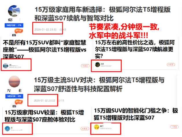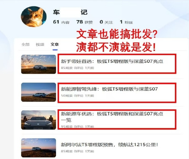目前深蓝汽车方面尚无回应,具体情况不可妄下定论;究竟是AI号集中生产相关内容追逐热点产品蹭流量,还是有其他公司从中作梗,这就需要两方各自展开调查,以及权威部门进行调查取证了。