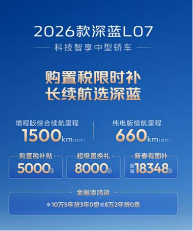 和同级相比,深蓝L07有何优势特点,适合哪类人?它是15万级唯一全系标配华为乾崑智能的轿车,也是同级唯一全系标配可变自适应悬架(FSD+HRS)的轿车。车长达4875mm,轴距达到2.9米,妥妥中型车大空间。CLTC工况下,深蓝L07新增最高续航660km纯电版,标配同级首发3C超充,充电10分钟续航百公里,跨省返乡也不怕;增程版综合续航里程可达1500公里,长途出行毫无焦虑。智能座舱方面,深蓝L07搭载高通骁龙8295P芯片+智慧五屏,拥有3D渲染交互以及多屏联动新玩法——考虑到“含华量”和优越的操控驾乘体验,对于年轻人来说,深蓝L07把“性价比”和“智价比”都拉满了,而 0息贷款政策,还能让你多留点现金过年!