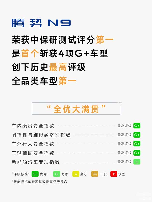 腾势N9在车内乘员安全指数、耐撞性与维修经济性指数、车外行人安全指数、车辆辅助安全指数四大核心分指数中均斩获最高等级G+评级,新能源汽车专项指数获G评级,全维度卓越安全成绩。在中国保险汽车安全指数C-IASI测试成绩中,腾势N9实现全优大满贯!扛起安全之王的大旗。