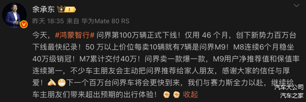 在现场,华为常务董事、终端BG董事长余承东对这个成绩的评价很直接——问界的百万之路,是“出一款爆一款”的市场认可,更是中国品牌打破外资豪华垄断的突围。