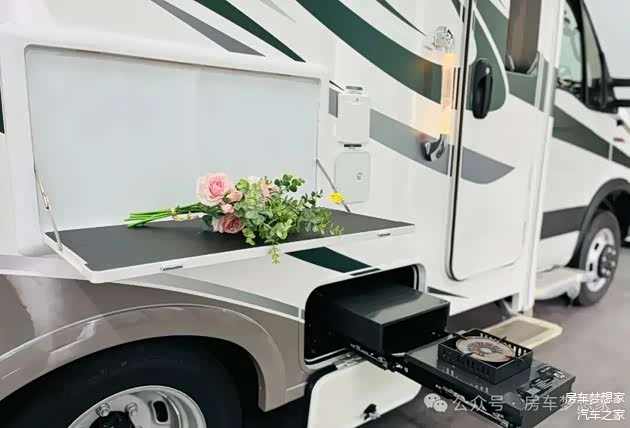白色车身配以精致拉花,整体造型大气而富有现代感。车身外部的便利设施丰富实用,包括3.5米的遮阳棚、户外抽拉燃油灶、可翻转的外置翻板、220V电源插座及出水口等。