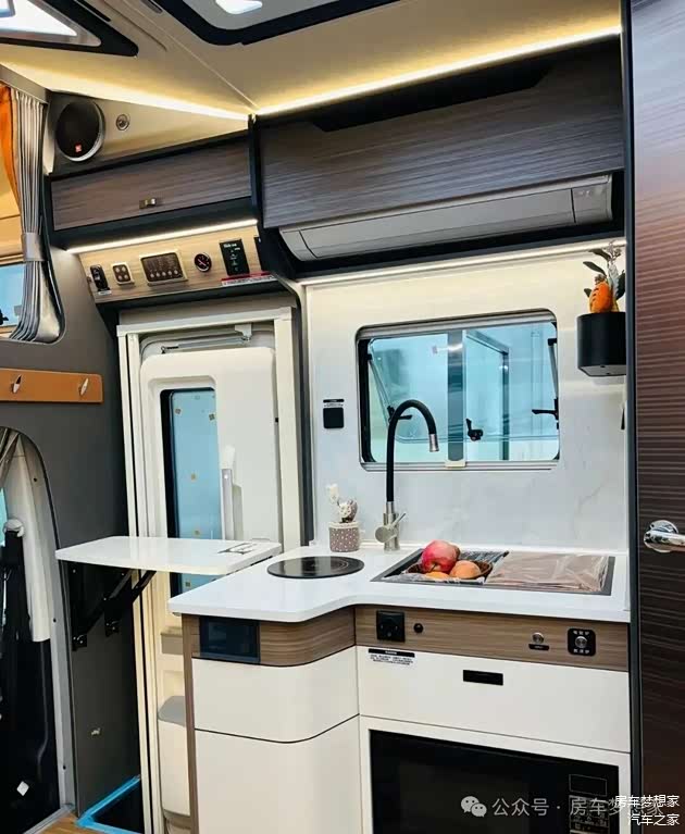 厨房区域的白色大理石操作台干净整洁,配置了电磁炉、房车专用水槽、水龙头和厨台延长板等,功能完善。台面下方还安装了一台多功能微波炉。