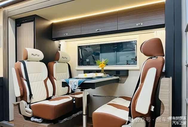 内饰采用暖白色调、浅棕色和柔和浅蓝色的巧妙融合,营造出温馨宜人的居家氛围。车内精选E0级环保板材与耐磨地板革,兼顾质感与环保标准。